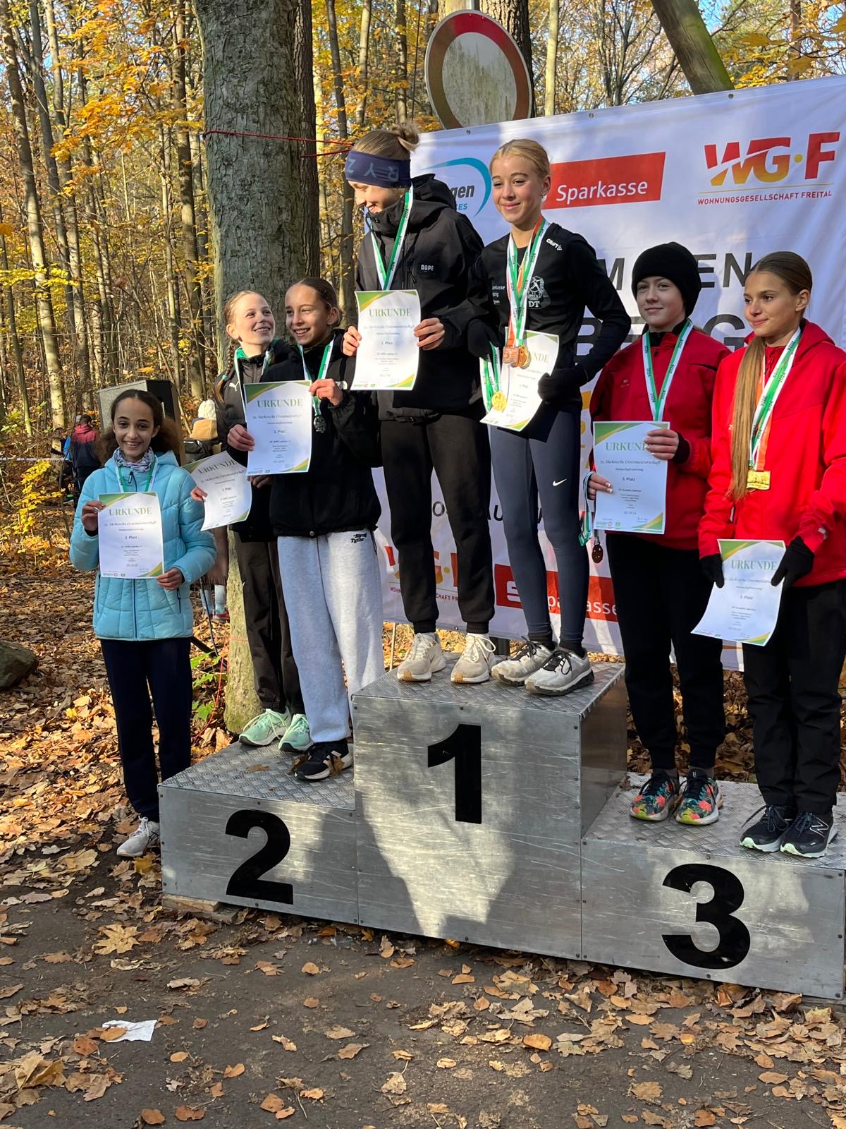 Unsere sechs Jugendlichen aus der Jugendtrainingsgruppe unserer Abteilung Laufsport erreichten in den großen Starterfeldern starke Platzierungen sowie drei Team-Medaillen: Bei den Jungs der M14 über 2 km lief Mattis Frankenstein in 7:18 min als Fünfter ins Ziel und Paul Schreck wurde Sechster der M15 in 7:28 min. Gemeinsam mit Erik Geisler von der Abteilung LAZ, Zweiter der M15, holten sich die Jungs den Landesmeistertitel in der Mannschaftswertung der MU16. Ebenfalls 2 km hatte die Altersklasse M12 zu bewältigen, hier waren 30 Jungs am Start, unter denen unser Jakob Bernerth in 8:24 min einen hervorragenden 8. Platz belegte. Ebenso bemerkenswert war die Leistung von Pauline Jankowicz, sie lief die 2 km in 8:29 min und war damit im Feld der 27 Mädchen der W14 die Achte. Die W13 musste 1,6 km laufen, das waren zwei kleine Runden und damit zwei Anstiege. Im Mittelfeld stark dabei waren unsere beiden Läuferinnen Martha Abraham in 6:40 min auf Rang 11 und Maxine Aeugle in 6:48 min auf Rang 14. Martha freute sich bei der anschließenden Siegerehrung über die Silbermedaille in der Teamwertung der U14, die sie gemeinsam mit den zwei Athletinnen der Abteilung LAZ Amelie Lieder und Heidi Redemann gewann.