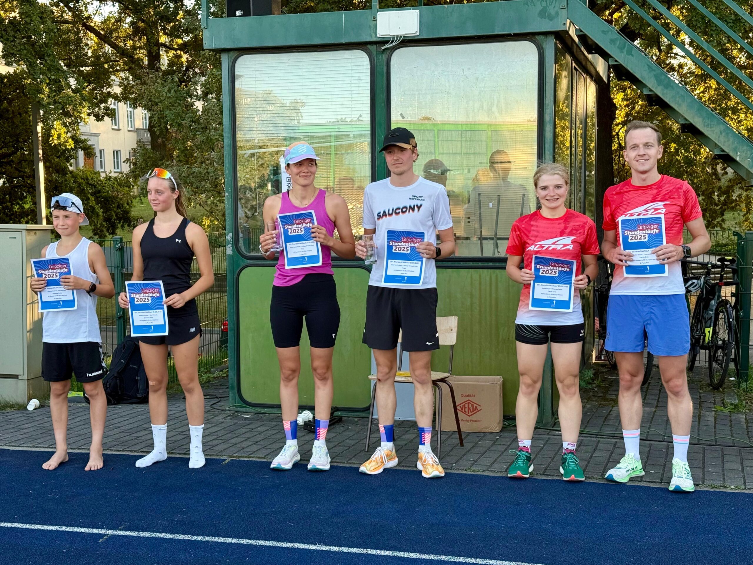 Nicht nur die Teilnehmerzahl, sondern auch die Leistungen stiegen diesmal merklich: Gleich drei Teams knackten die 19-km-Marke, was bei den vorherigen zwei Stundenpaarläufen auf dem Testfeld keinem Paar gelungen war. Sieger wurde der Waldstraßen-Express Falk Schneider und Juri Berthold mit 19.415 m vor Benjamin Lindner/Per van Vlerken (19.099m) und Arik und Jonah Lange (19.028m). Mattis Frankenstein und Magnus Kühn, seit ihrem Schülerpraktikum im Leipziger Laufladen nun zum dritten Mal als „Die Praktikanten“ gemeinsam am Start, steigerten sich enorm und erreichten 17.522m (2. Platz Kinder / 10. Platz Männer). Bei den Frauen waren die Track Queens Sindy Kermer und Sylvia Frankenstein nicht zu schlagen, mit 17.440 m erzielten sie das beste Frauen-Resultat des Jahres. Luisa Bayer und Thomas Lenor (Cornis Girls) standen in der Mix-Wertung erneut auf dem Podium – diesmal auf Rang 2 mit 17.173 m. (sf)