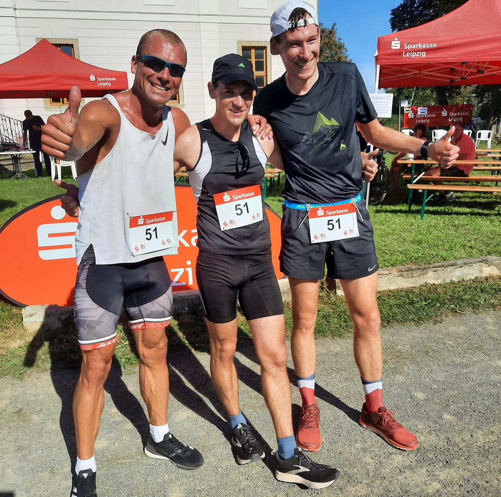 Doch noch weitere Mitglieder aus unserer Abteilung waren in Störmthal dabei, so Antje Reimer, die mit Nadine Troschke und Patrick Reimer bei den Mixteams in 3:26:58 h als 19. in das Ziel kamen. Mit Olaf Ueberschär war ein Stammgast beim Südraummarathon dabei, und zusammen mit Sascha Strötzel und Jascha Timm feierten die Drei nach 2:20:56 h mit sechs Minuten Vorsprung den Gesamtsieg! Übrigens Olaf und Sascha, der eigentlich seine leistungssportliche Laufbahn beendet hat und nur noch sporadisch läuft, sind mit jeweils acht ersten Plätzen die erfolgreichsten Südraummarathonis. Ja, und dann war da noch das Mix–Team mit Marc Werner, unserer Kathrin Bogen und Gregor Bogen mit viel „Südraumerfahrung“, die als Favoriten gehandelt wurden. Aber Kathrin stürzte nach dem Start mit dem Fahrrad und verletzte sich am Knie – da ging es im Team doch etwas langsamer – am Ende war es nach 2:36:39 h Rang zwei aber trotzdem noch eine tolle Zeit! Dann war da noch Helge Hallmann von der SG LVB, der nun schon alle 24 Läufe absolviert hat und in Leipzig auch als Organisator von Läufen bekannt ist – „Bis zur 30. Teilnahme möchte ich noch dabei sein“ erzählte er vor dem Start – viel Erfolg Helge! (ps)