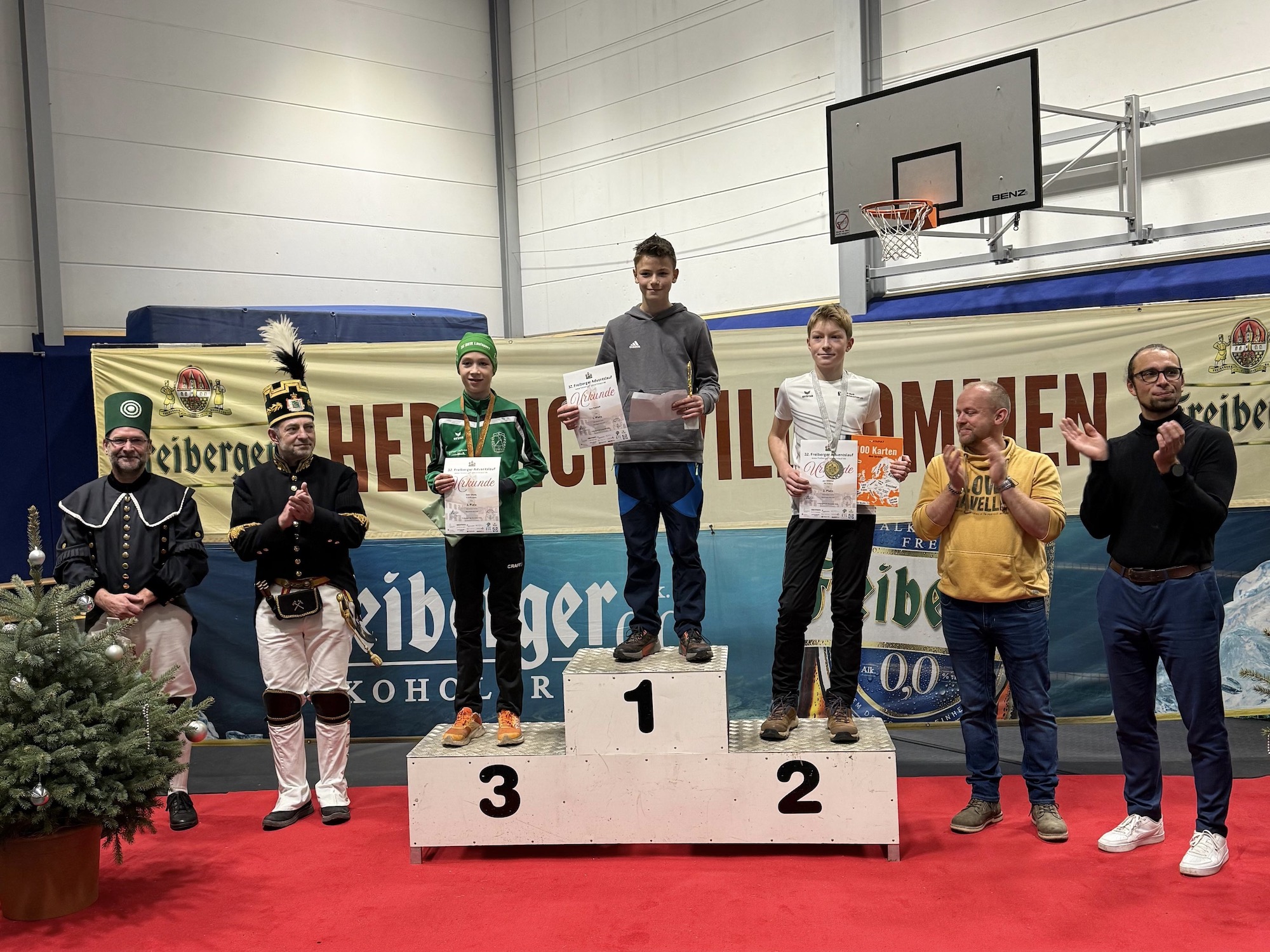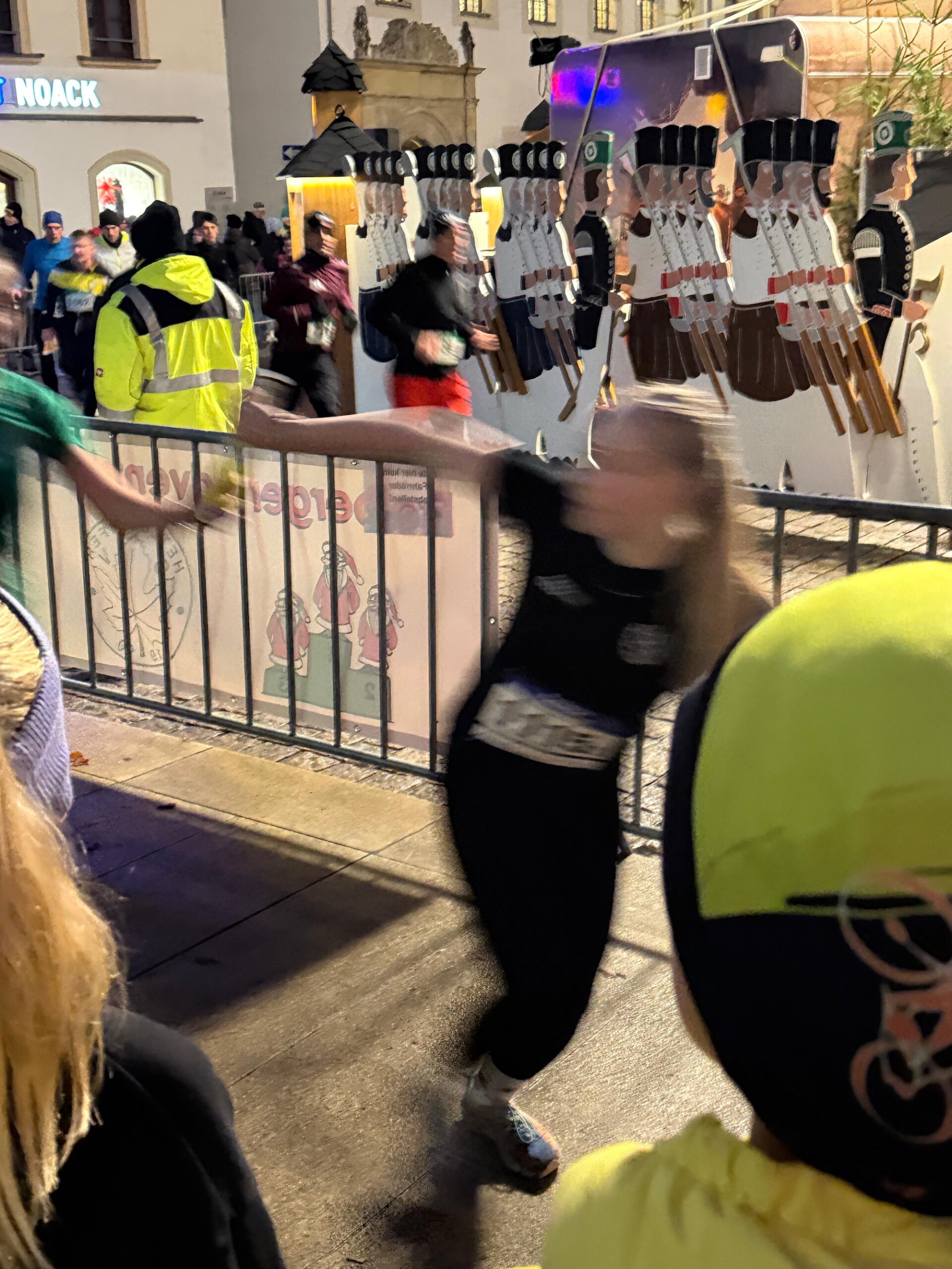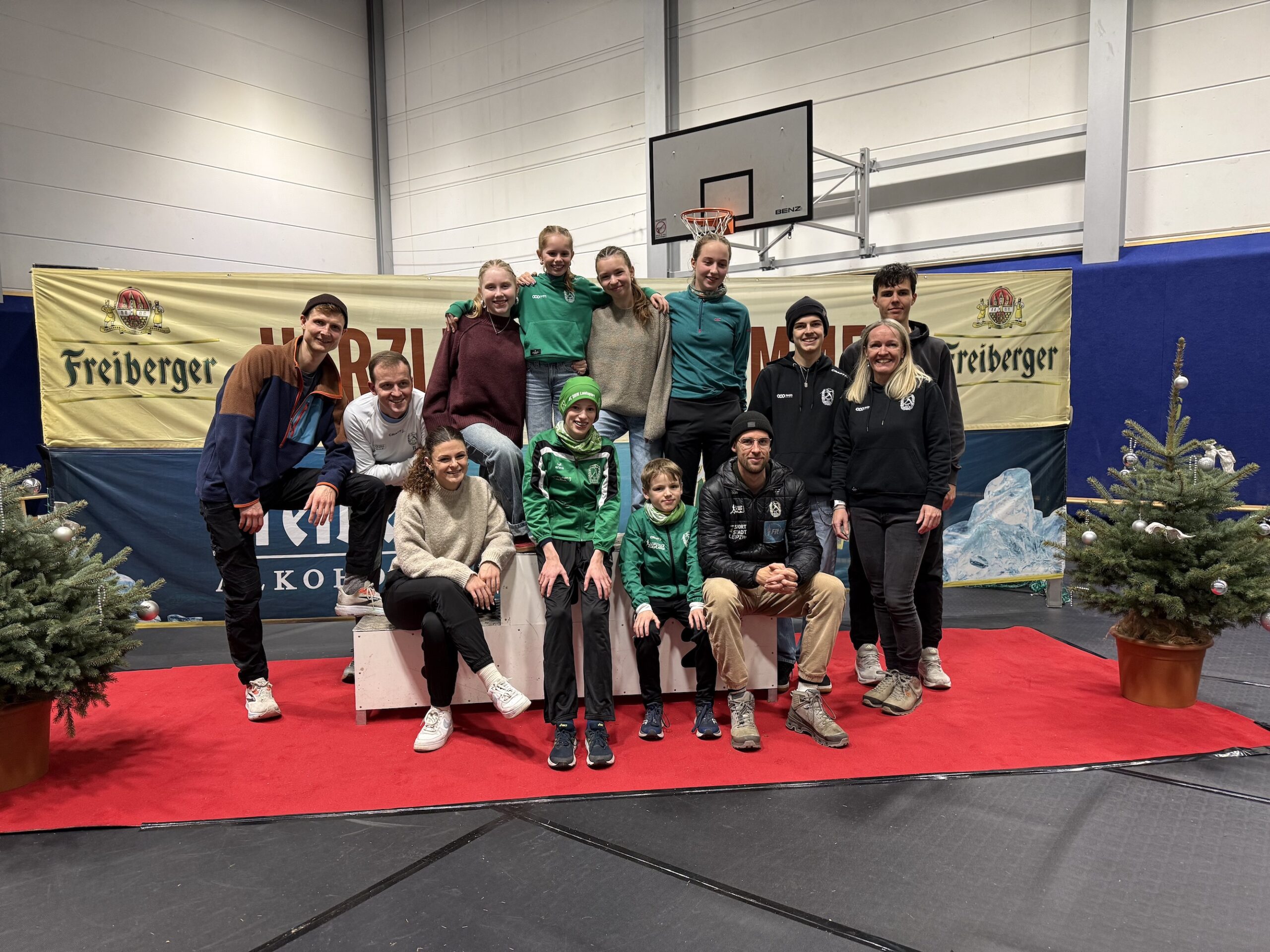 Der Freiberger Adventslauf, einer der beliebtesten Laufveranstaltungen in der Vorweihnachtszeit, lockte in diesem Jahr so viele Laufbegeisterte an wie noch nie: rund 1.300 Läuferinnen und Läufer standen am 29. November an der Startlinie am Freiburger Christmarkt. Bei festlicher Beleuchtung führte die profilierte 3-km-Runde vom Marktplatz an der Stadtmauer entlang, am Schloss vorbei und die weihnachtlich geschmückte Burgstraße wieder hinauf zum Markt. Das Highlight war in diesem Jahr die Trommelgruppe Blechlawine aus Dresden, die vor dem Schloss den Vorbeilaufenden ordentlich einheizte. Diese tolle Stimmung wollten wir uns nicht entgehen lassen und reisten mit einem Team von 15 Athleten nebst Trainer, Eltern und Großeltern nach Freiberg. Tolle Erfolge gab es zunächst bei unseren Einzelstartern über 3 und 6 km: Beim Teenielauf über 3 km erreichte Odin Chudy in 11:08 min Rang 3 der MU14 und beim 6-km-Volkslauf war Mattis Frankenstein in 20:48 min Gesamtfünfter und Zweiter der MU16. Kevin Richter finishte in 23:16 min und Robert Frankenstein in 28:03 min. Anschließend gingen die insgesamt 86 Staffelteams über 4 x 3 km auf die Strecke. Das SC DHfK Leipzig Team Jungs mit Arne Sterzing, Felix Frankenstein, Jorin Sterzing und Thomas Lenor schaffte mit einer Laufzeit von 45:19 min den Sprung auf das Podium und freute sich über Platz 3 in der Kategorie Herren. Das SC DHfK Leipzig Team Mädels in der Besetzung Maxine Aeugle, Chayenne Kuntze, Elise Seuß und Thea Schlichting erkämpfte sich in 56:31 min einen tollen 7. Platz unter den 19 Frauen-Staffeln und Hannah Recknagel und Maximilian Neubert, spontan als Mix-Staffel angemeldet, erreichten in 47:30 min Rang 4. Den 12-km-Hauptlauf bestritten Kevin Richter, der in 50:27 min auf Platz 7 der M20 landete, und Sylvia Frankenstein, die zweite Frau und Altersklassensiegerin in der W45 in einer Zeit von 52:05 min wurde. Nach den Siegerehrungen ließen wir den Tag auf dem Weihnachtsmarkt ausklingen und füllten die Energiespeicher mit allerlei leckeren Sachen wieder auf. (sf)
