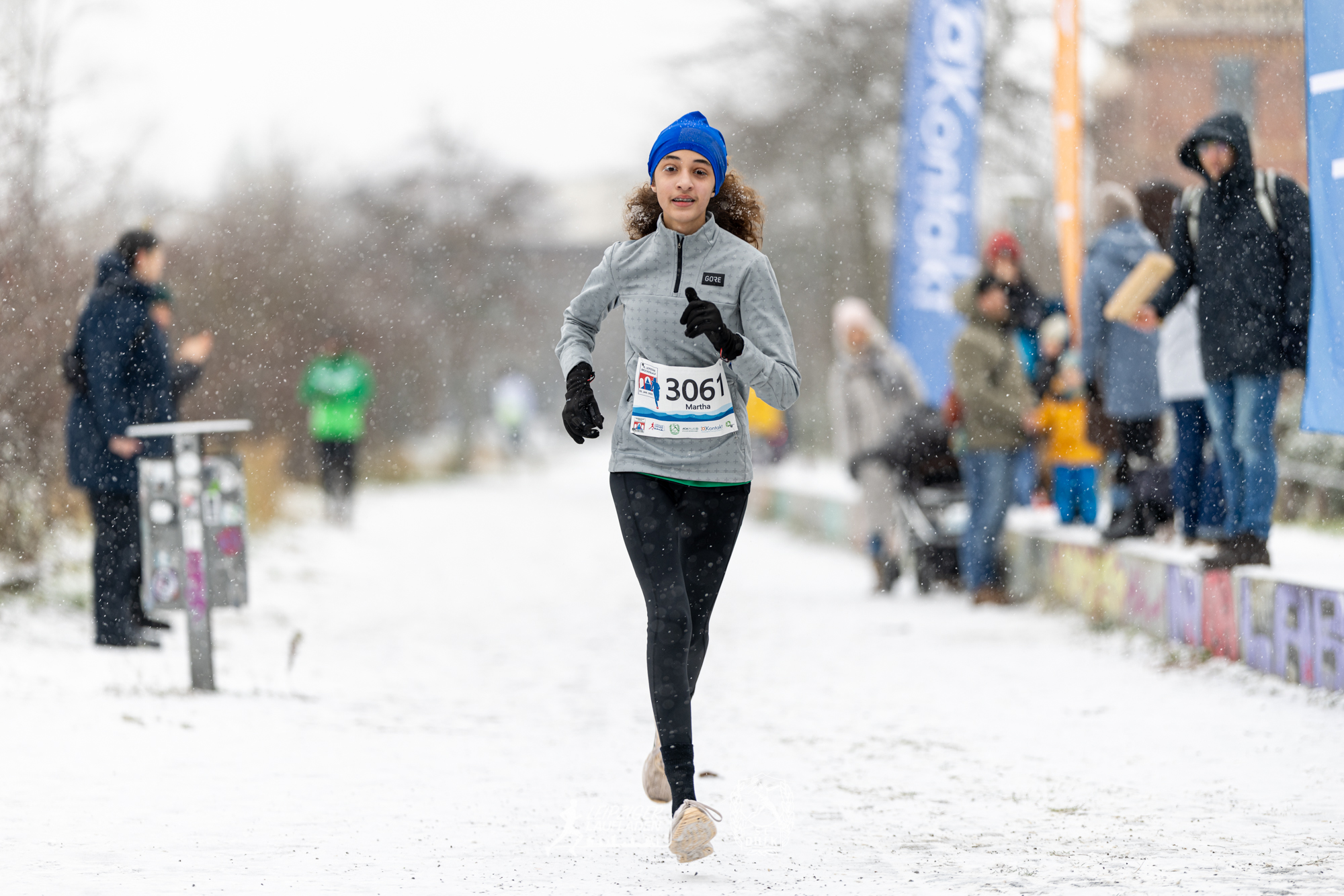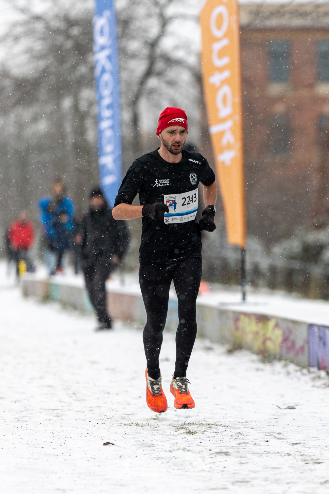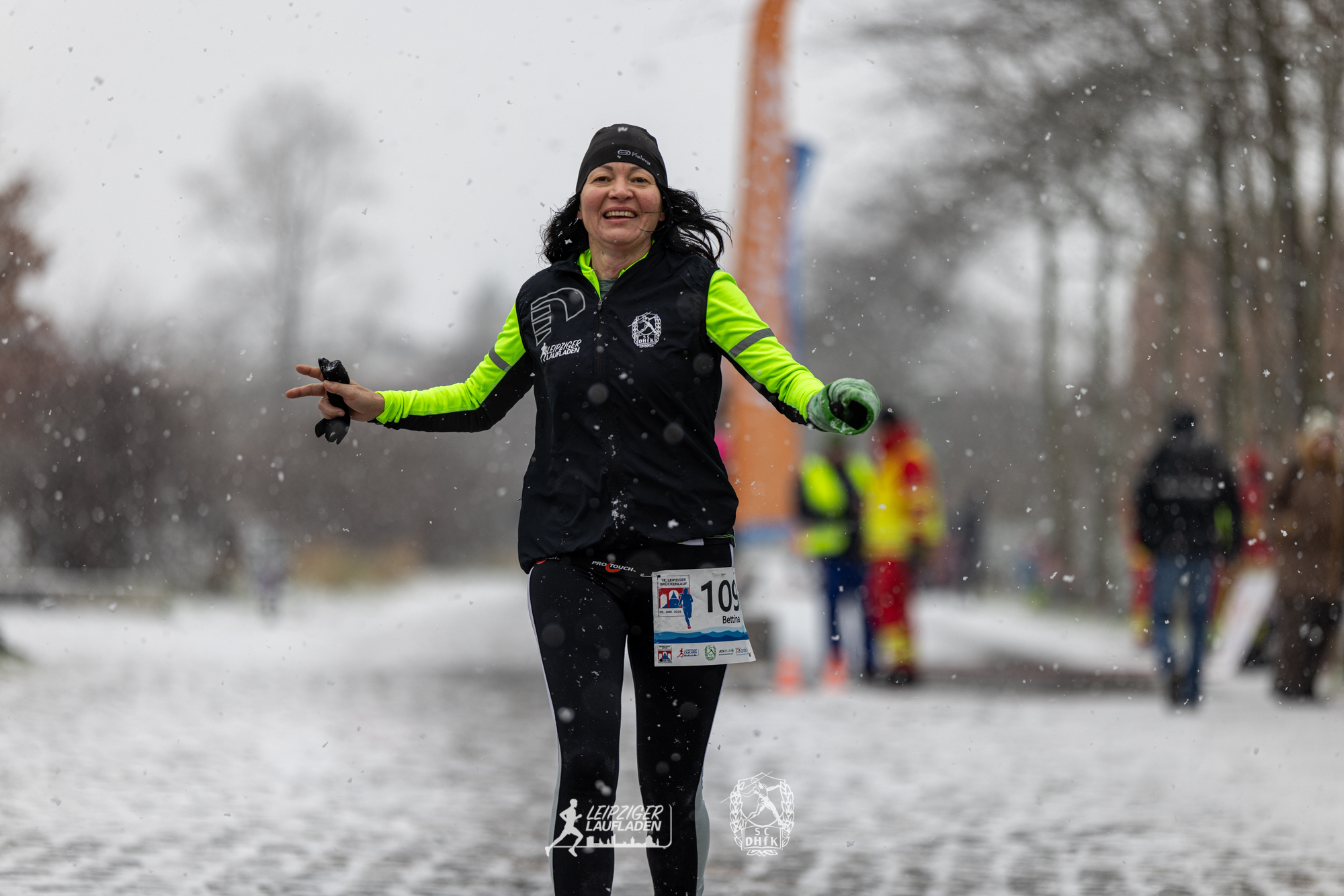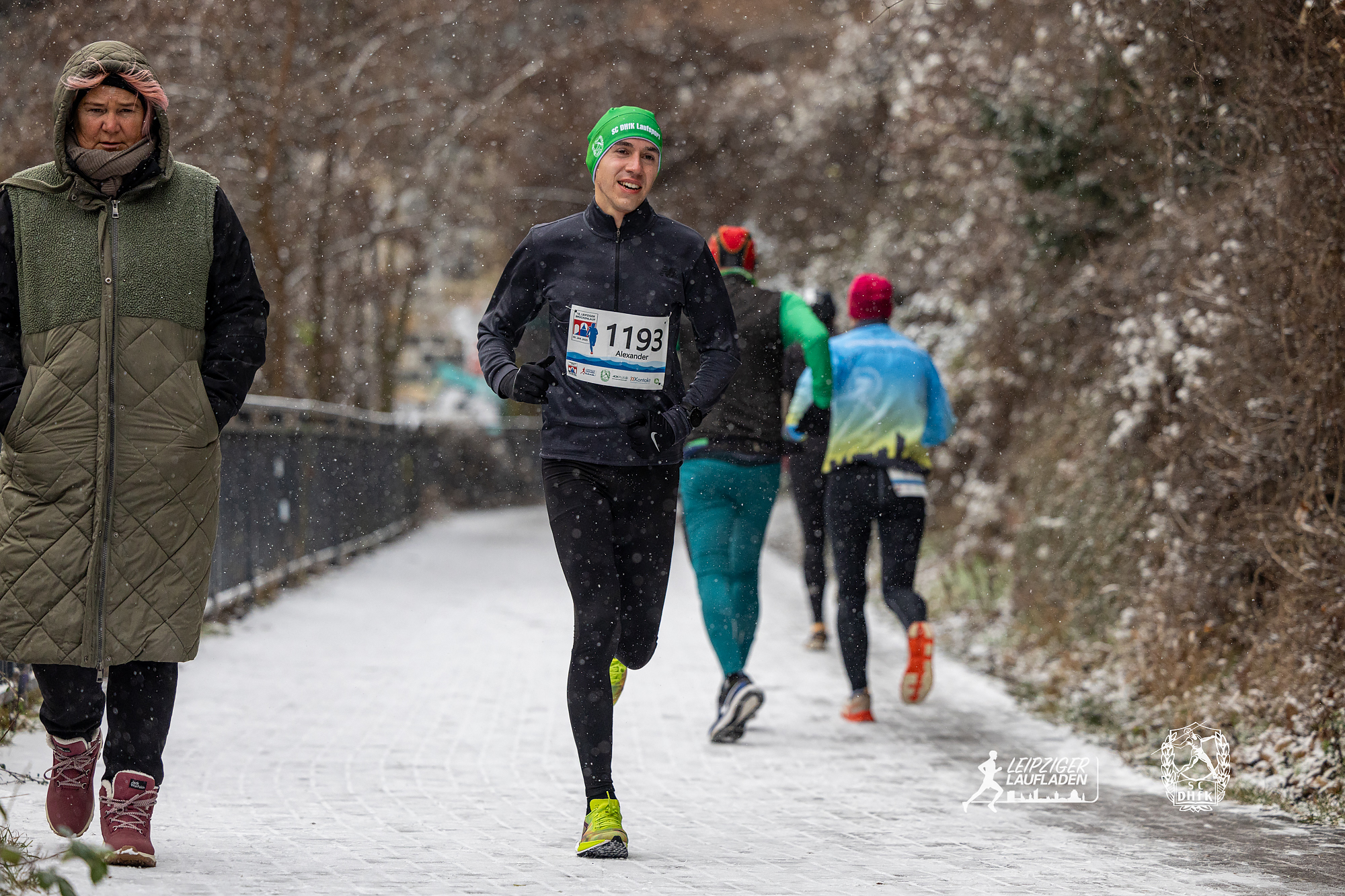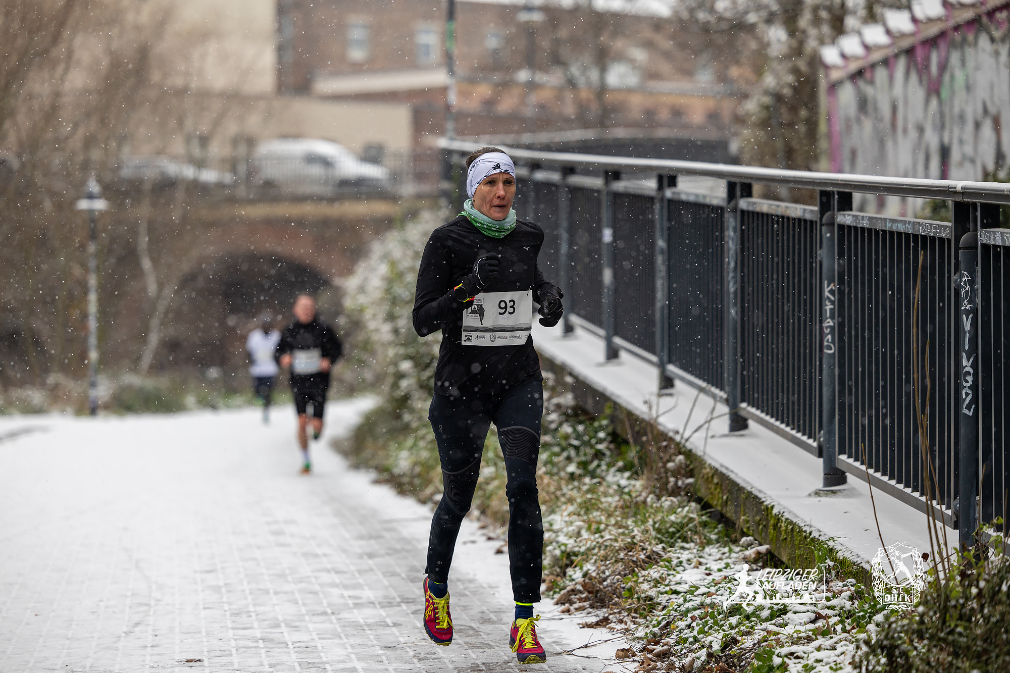 Während die Wege beim Einlaufen noch schneefrei und trocken war, verwandelten kurz vor dem Start dicke Schneeflocken die Strecke am Karl-Heine-Kanal in eine tolle Winterlandschaft. Auf dem Schnee lief es sich freilich schwer und in den Kurven konnte es ziemlich rutschig werden, aber glücklicherweise kamen alle Teilnehmer sturzfrei ins Ziel.