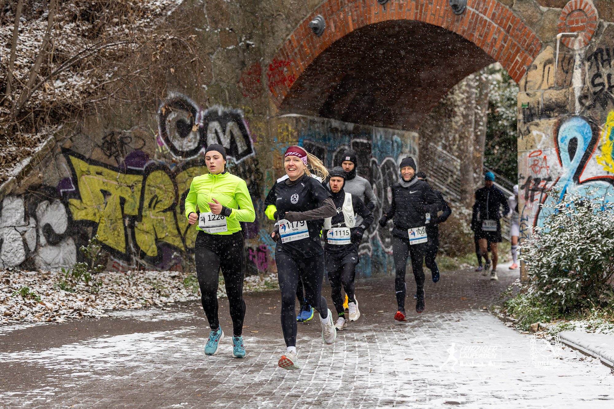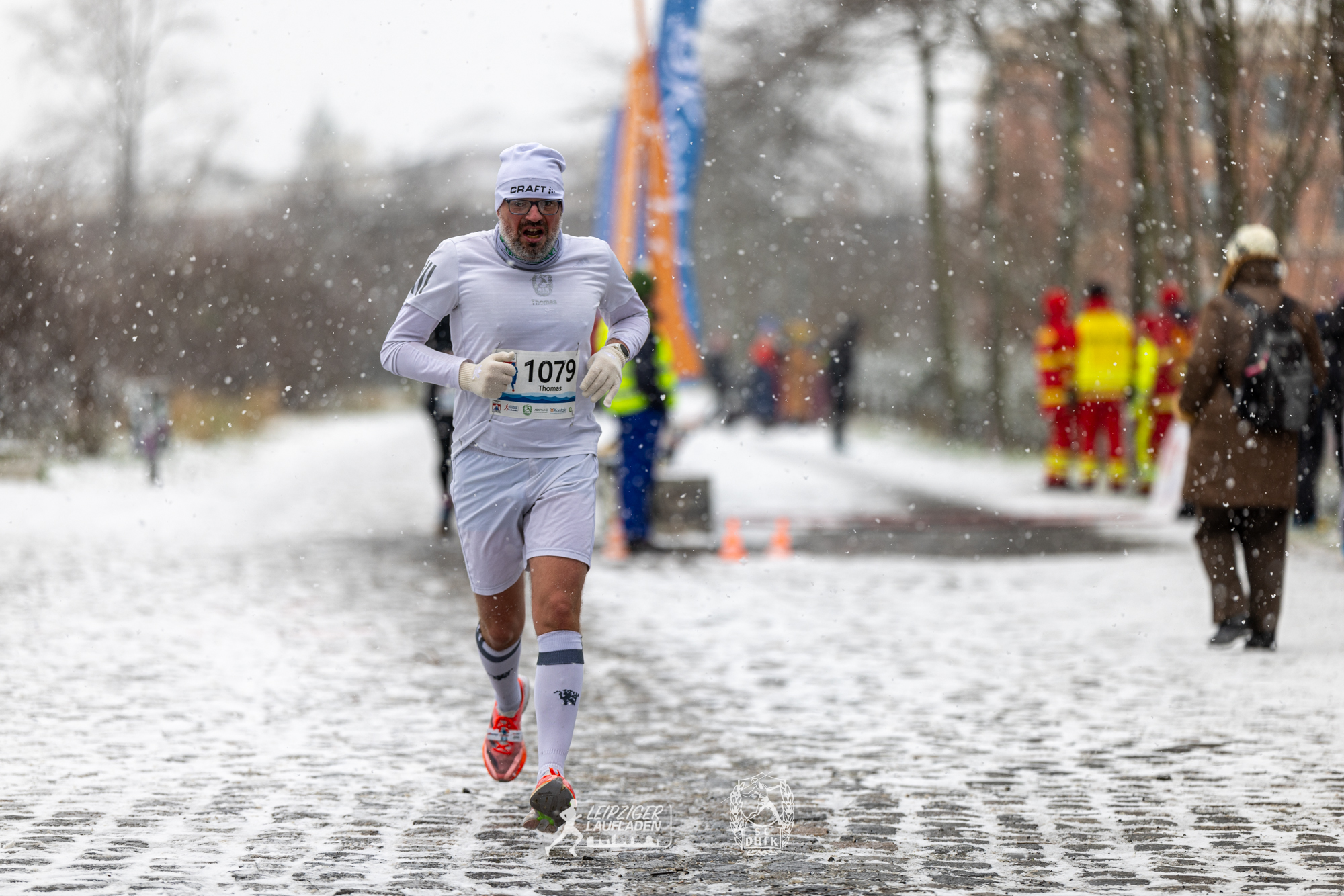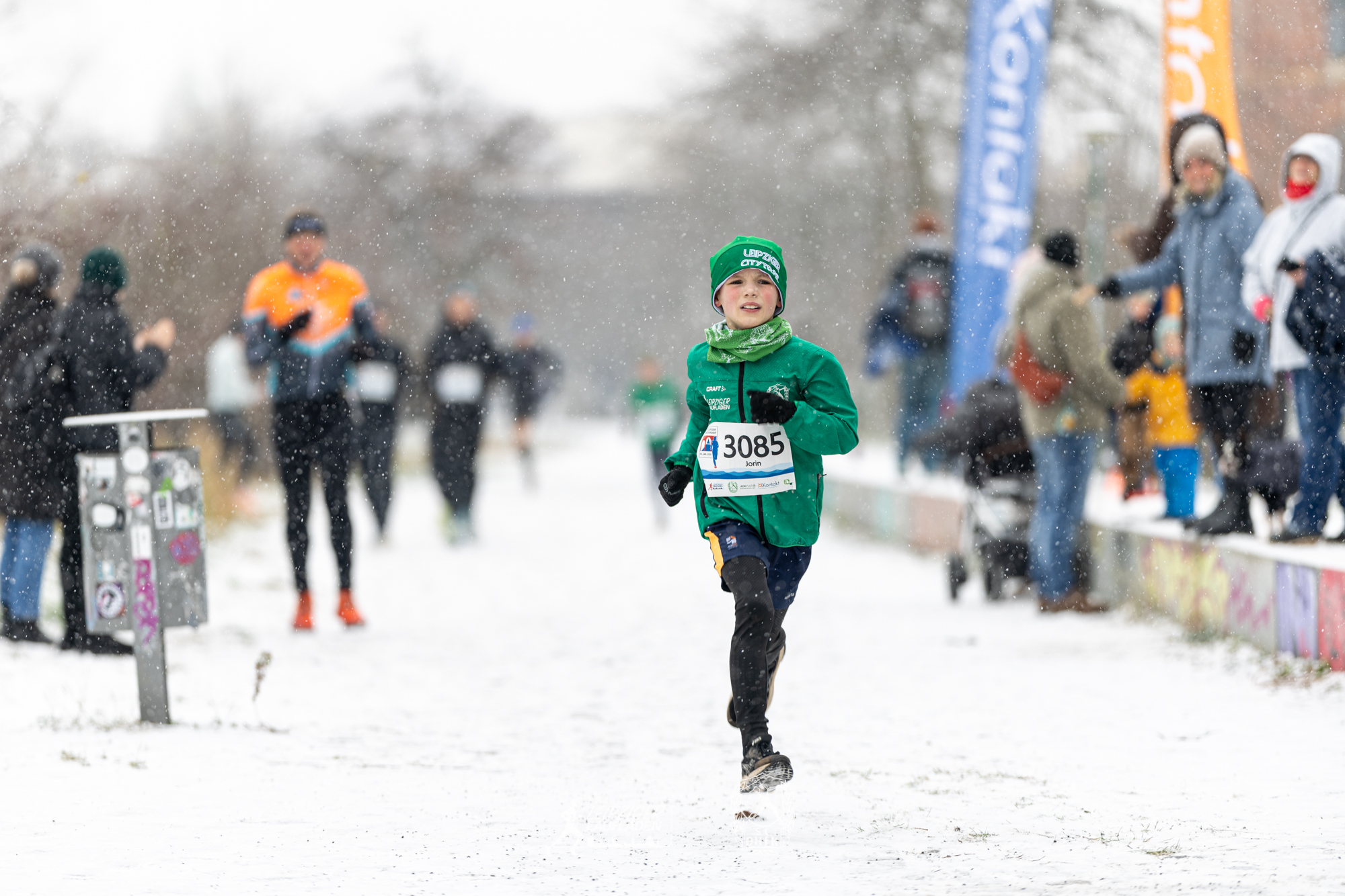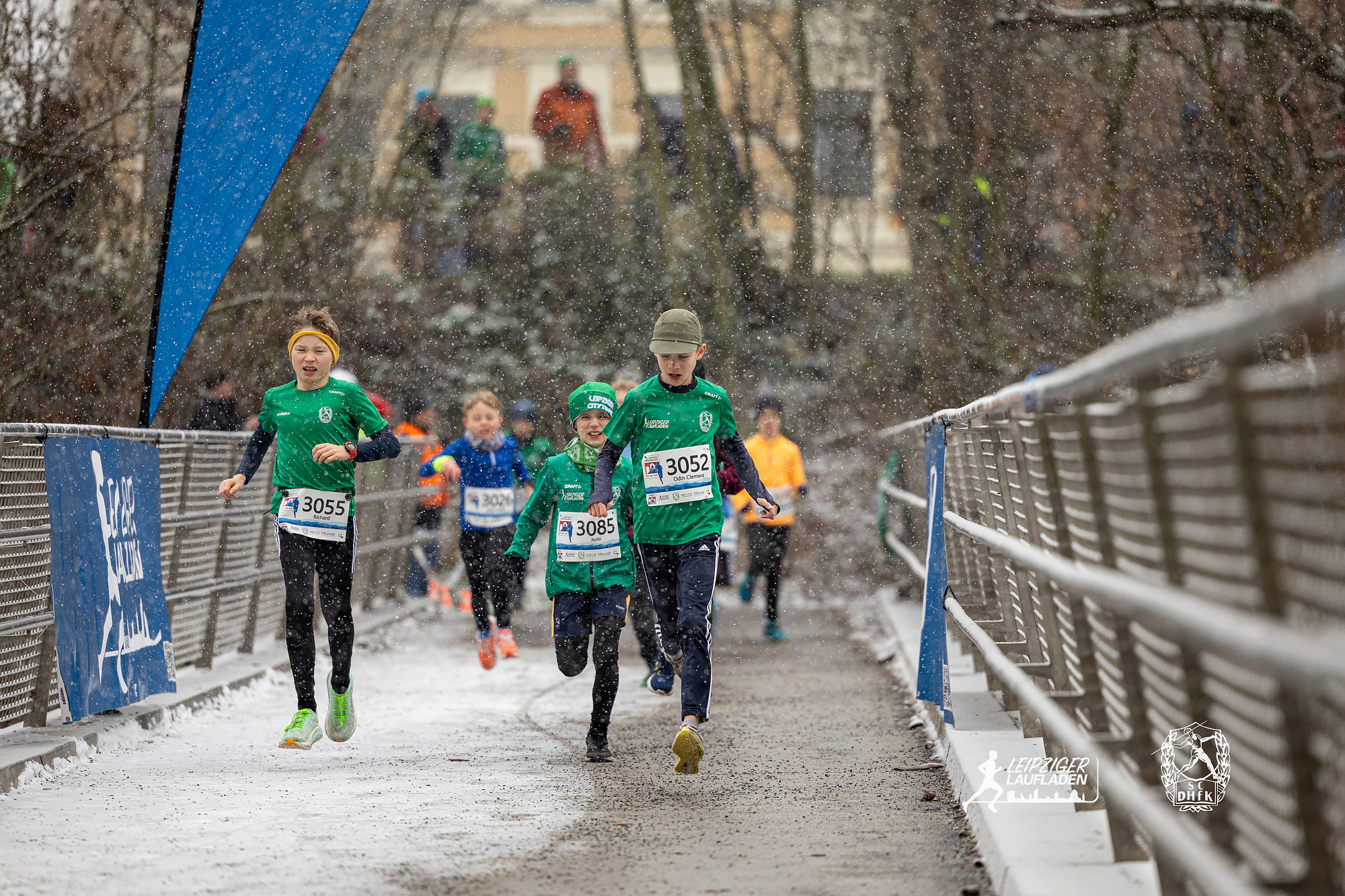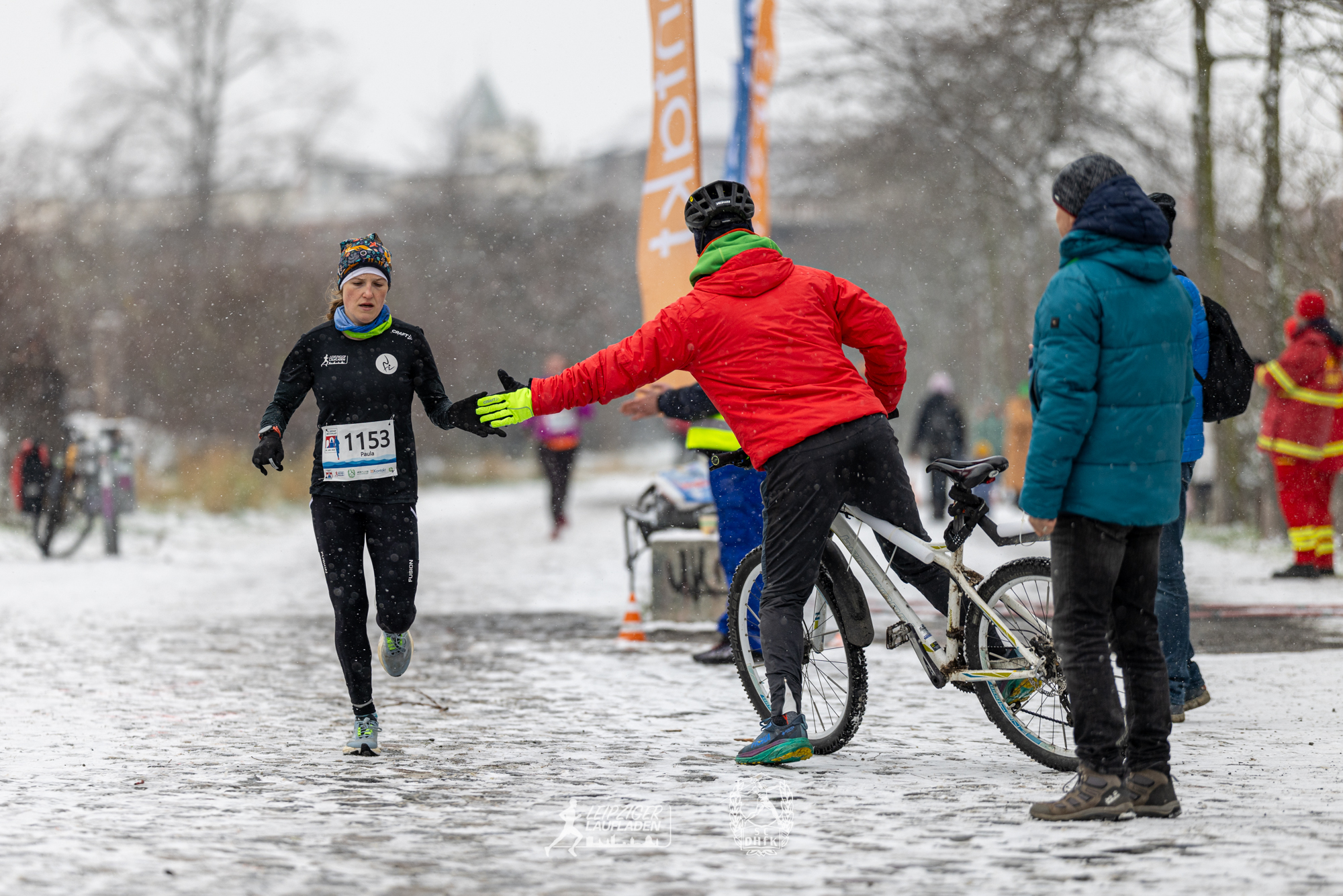 Während die Wege beim Einlaufen noch schneefrei und trocken war, verwandelten kurz vor dem Start dicke Schneeflocken die Strecke am Karl-Heine-Kanal in eine tolle Winterlandschaft. Auf dem Schnee lief es sich freilich schwer und in den Kurven konnte es ziemlich rutschig werden, aber glücklicherweise kamen alle Teilnehmer sturzfrei ins Ziel.