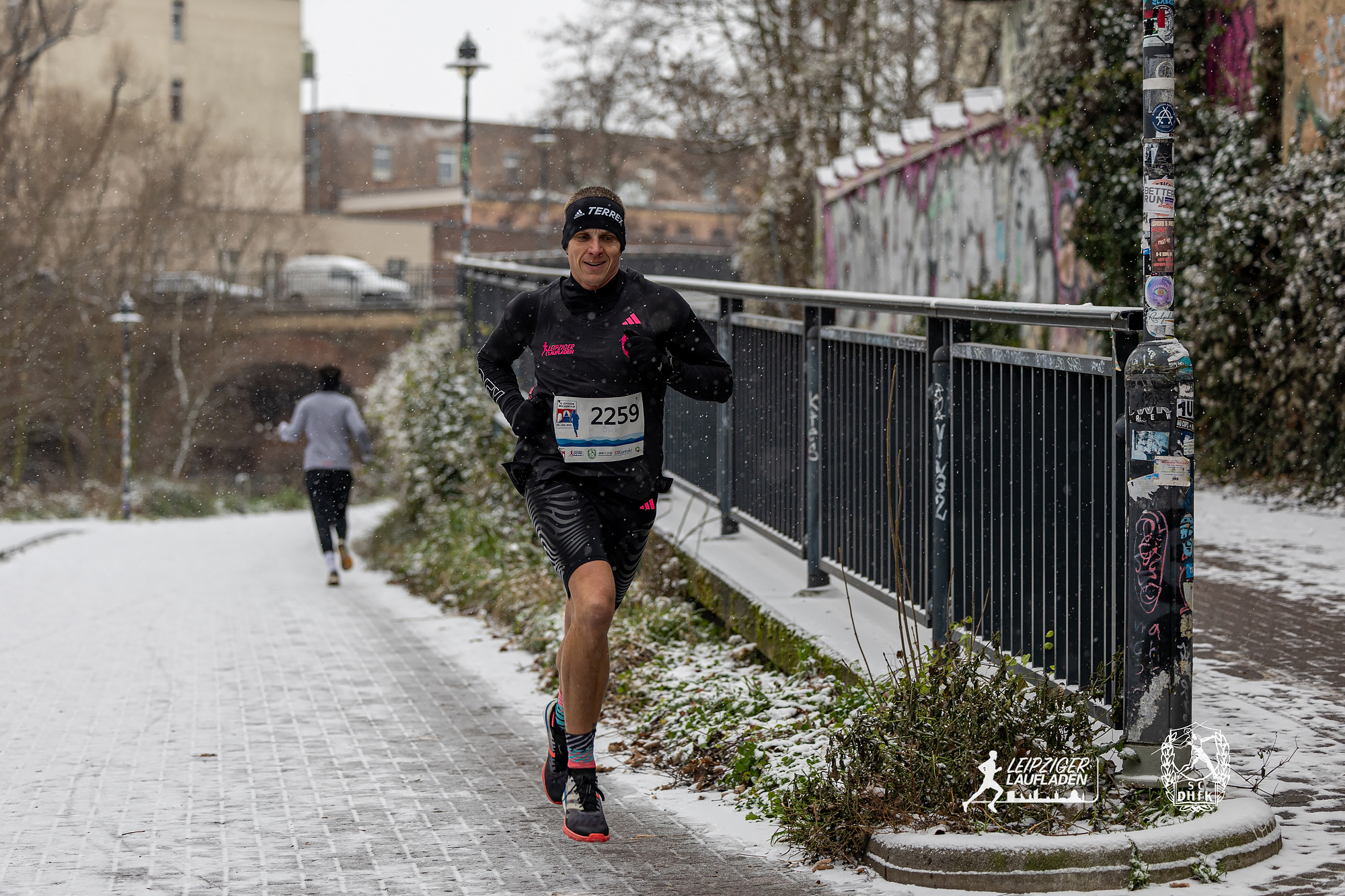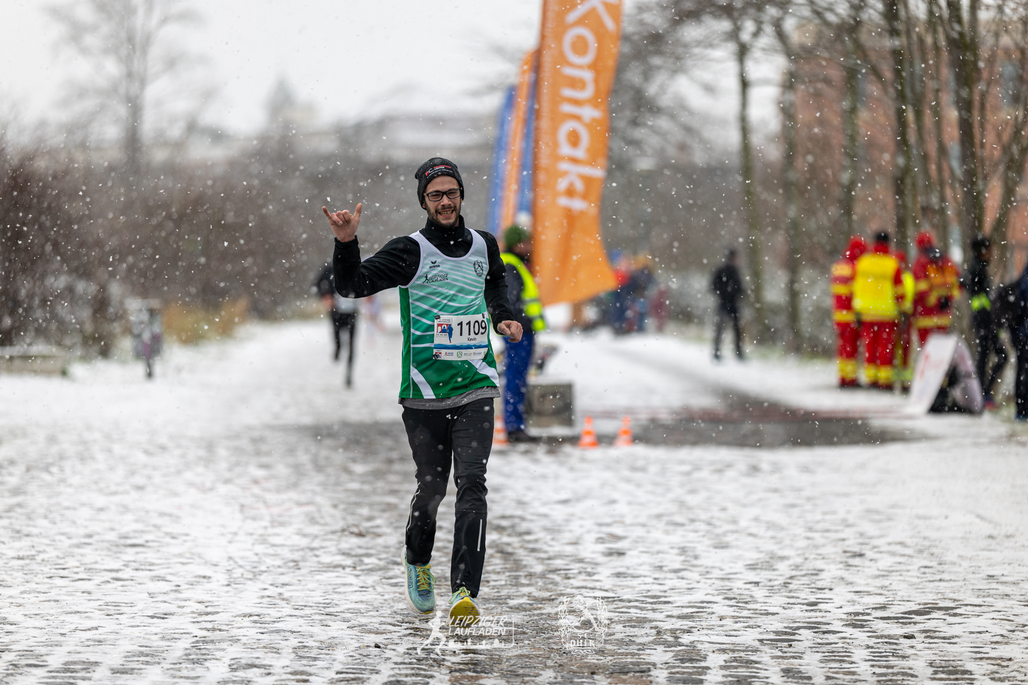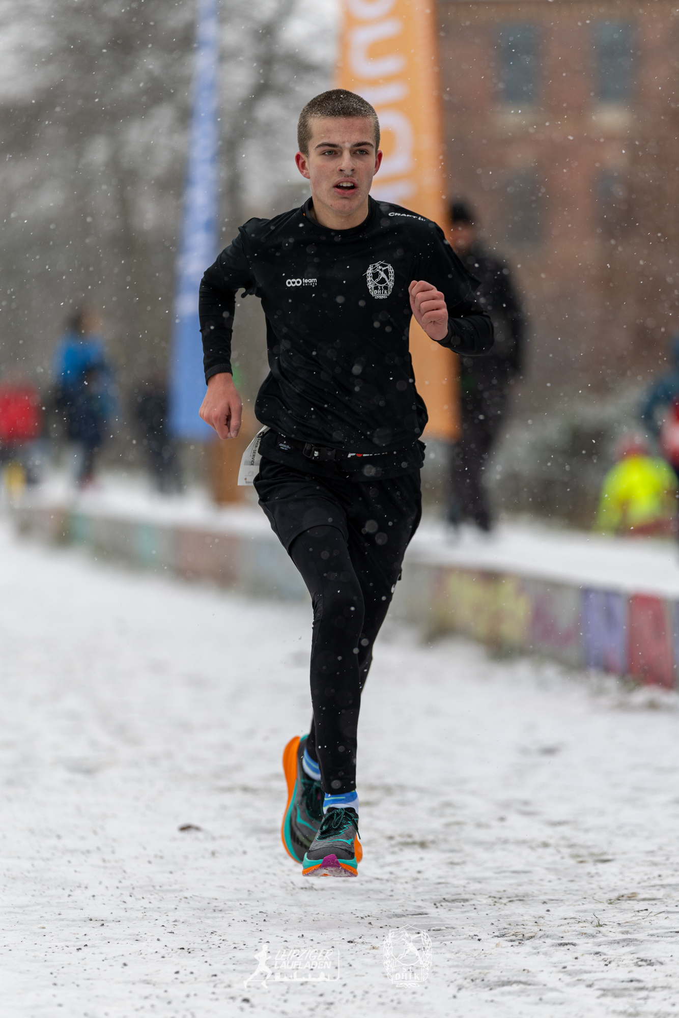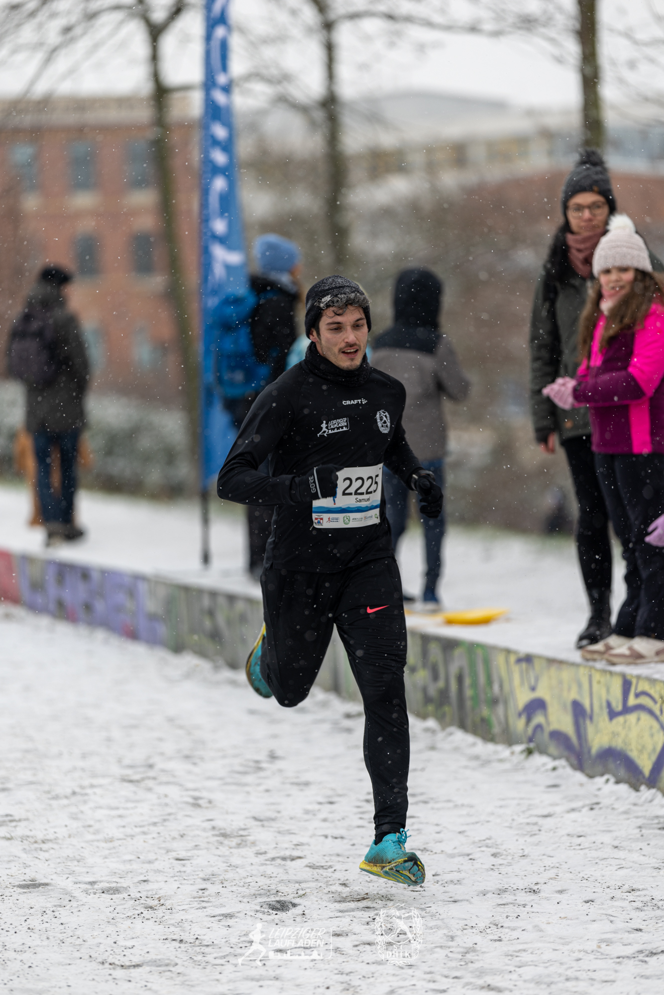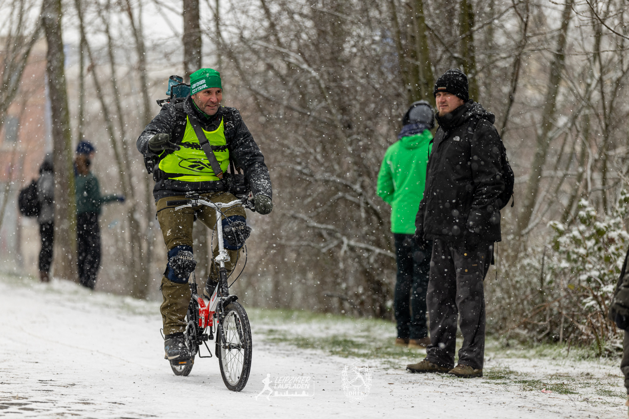 Während die Wege beim Einlaufen noch schneefrei und trocken war, verwandelten kurz vor dem Start dicke Schneeflocken die Strecke am Karl-Heine-Kanal in eine tolle Winterlandschaft. Auf dem Schnee lief es sich freilich schwer und in den Kurven konnte es ziemlich rutschig werden, aber glücklicherweise kamen alle Teilnehmer sturzfrei ins Ziel.