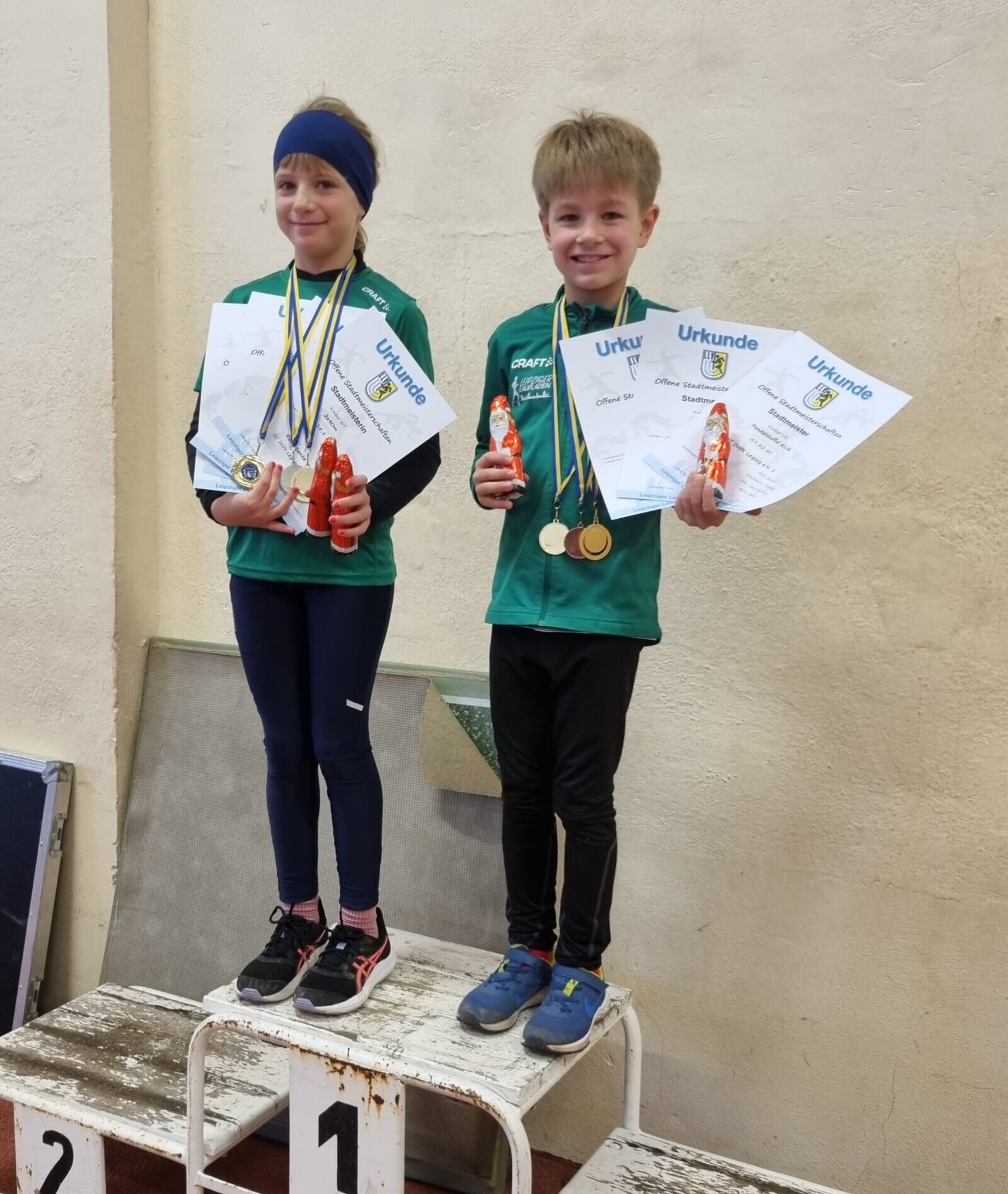 Unsere Jüngsten räumten ordentlich Medaillen und damit verbunden Schokoweihnachtsmänner ab: Senta Rost (W7) sprintete über 40m zu Gold und erreichte mit einer Bestleistung 2,79 m den 2. Platz im Weitsprung. Ebenso zu Gold sprintete Neo Wendeborn in der M7 in 7,3s s und 2,63m bedeuteten Platz 3 im Weitsprung.