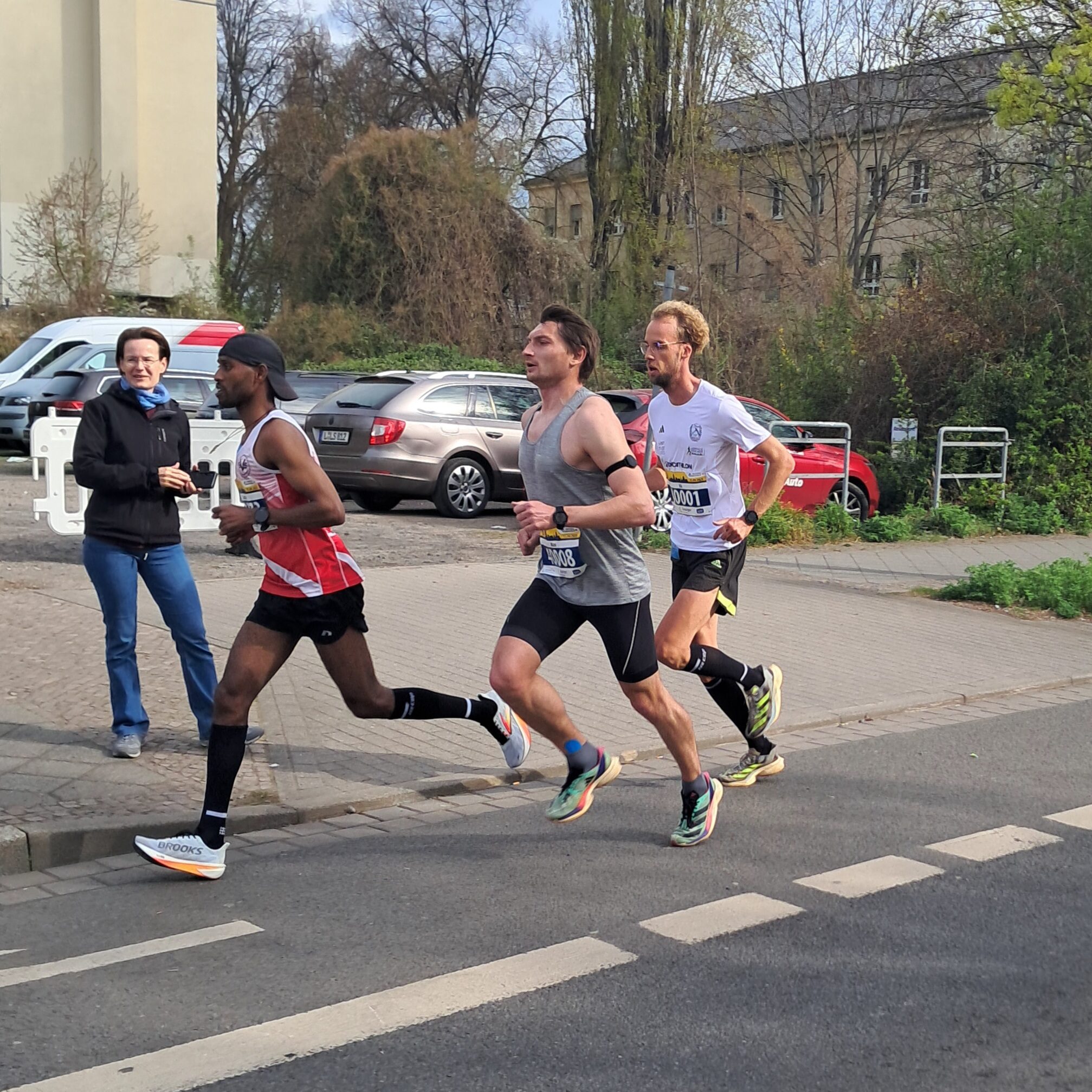 Beim Halbmarathon war ein riesiges Läuferfeld mit über 4.500 Teilnehmenden unterwegs. Während es am Start noch kühl war und leicht nieselte, wurde es in der zweiten Rennhälfte unangenehm sonnig und warm, was so manchen Traum von einer schnellen Zeit platzen ließ. Bei den Männern siegte wie im Vorjahr der Nordische Kombinierer Jakob Lange (PTSV Rosenheim) in 1:07:51 h. Doch nicht weit dahinter kamen unsere Läufer ins Ziel. Drei von ihnen blieben unter 1:20h: Cornelius Weber in 1:17:48 h als elfter Mann und Fünfter der M20, Samuel Schubert in 1:18:08 h auf Gesamtplatz 13 und Fünfter der M35 und Sebastian Huhn in 1:19:03 h auf Platz 8 der M35. Zweitbester der M40 wurde Roberto Schumann in 1:21:00 h, Tim Wiegand lief in 1:24:16 h auf Platz 8 der M30, Christoph Hißbach folgte in 1:24:42 h auf Platz 9 der M40 und Max Roßbach finishte in 1:28:02 h (27. Platz M30). Toll auch unsere Läufer in den höheren Altersklassen: Jürgen Nowag, Dritter der M65 in 1:50:24 h, Jens Weniger, Vierter der M55 in 1:34:45 h und Getu Abraham, Siebenter der M55 in 1:36:32 h. Unser jüngster Halbmarathonläufer war Magnus Kühn, der in 1:48:48 h Fünfter der MU18 wurde. Bei den Frauen gewann Lucia Hemeling (SCC Berlin) den Halbmarathon in 1:18:25 h. In den Top Ten der Frauen landeten drei Läuferinnen unserer Abteilung: Paula Gredig lief in 1:26:09 h auf Rang 5 und war damit Zweite der W20, knapp dahinter folgte auf Rang 6 Marina Wilson in 1:26:45 h als Zweite der W35, und unsere Sandra Boitz war in 1:28:28 h zehnte Frau und Beste der W50. In der W45 landeten Tina Laux in 1:46:59 h und Susann Materlik in 1:50:24 h auf den Plätzen 9 und 11.
