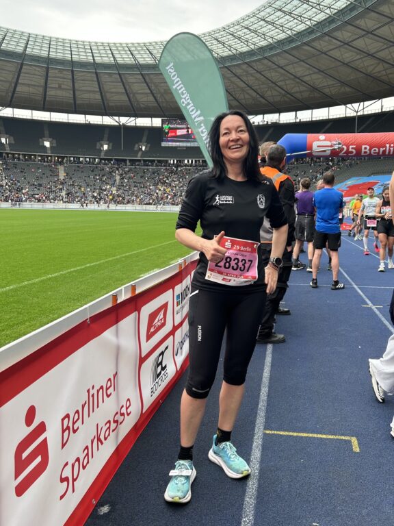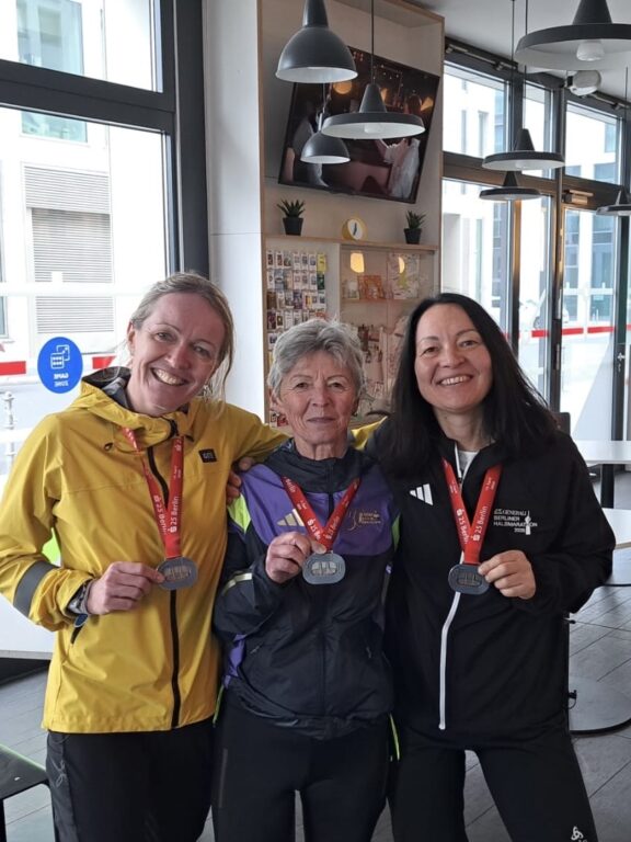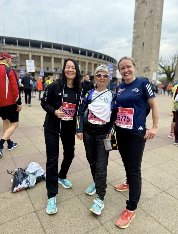 Auch in Berlin blieb es am Sonntagvormittag noch trocken, als mit dem S 25 Berlin einer der traditionsreichsten Straßenläufe Deutschlands ausgetragen wurde. Rund 14.000 Läuferinnen und Läufer gingen bei der 45. Auflage an den Start. Seine Ursprünge hat die Veranstaltung im Jahr 1981, als die französischen Alliierten den „25 km de Berlin“ ins Leben riefen, damit gilt er als ältester Citylauf der Hauptstadt. Die namensgebende Distanz ist dabei kein Zufall: Die 25 Kilometer galten im Straßenlauf lange Zeit als klassische Mitteldistanz zwischen 10 km und Marathon, bevor sich ab Anfang der 1990er-Jahre der Halbmarathon international durchsetzte. Zu den absoluten Höhepunkten beim S 25 zählen traditionell der Start auf dem Olympiaplatz sowie der stimmungsvolle Zieleinlauf in das Olympiastadion. In diesem Jahr führte die Strecke aufgrund von Bauarbeiten allerdings nicht durch die Innenstadt, sondern überwiegend durch den Grunewald, was sich nach Ansicht unserer drei Starterinnen als angenehme Alternative erwies. Bettina Wellner und Sylvia Frankenstein liefen gemeinsam nach 2:04:57 h auf Platz 5 und 6 der W50 ins Olympiastadion ein, Andrea Weber wurde in 2:21:40 h sogar Dritte ihrer Altersklasse W65. Damit waren unsere Frauen schneller als Bundesaußenminister Johann Wadephul, der die 25 km in 2:29,40 h absolvierte. (sf)